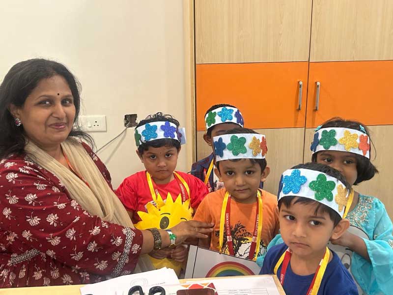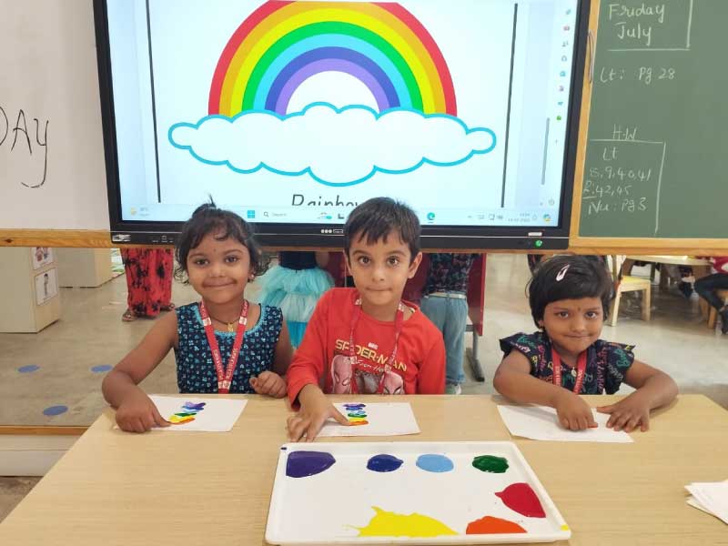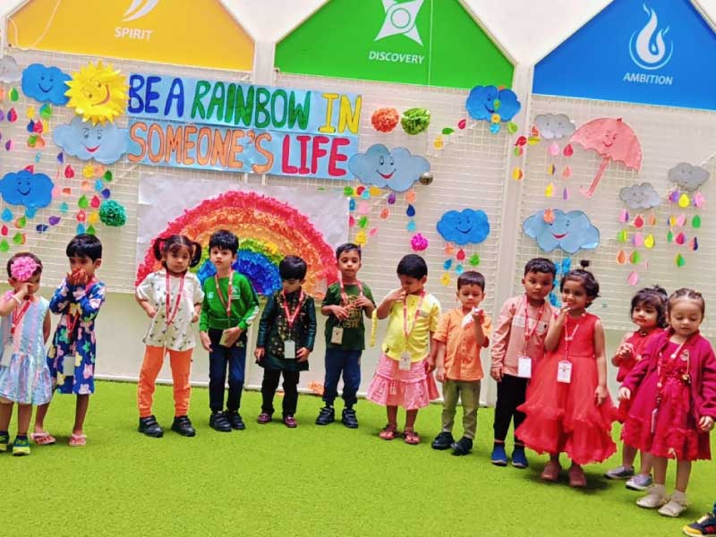 Rainbows are among nature's most spectacular spectacles. Today, our children celebrated Rainbow Day, which was interwoven into the ongoing theme of "Raving Rain." It was a colorful and happy day to remember. On this particular day, a magnificent rainbow lights up the sky after the rain. Rainbow Day was an exciting opportunity for young children to learn about colours and appreciate the uniqueness of each shade in the rainbow. Students dressed as brightly as a rainbow. To comprehend how a rainbow is generated, students participated in a range of pleasant activities that strengthened their cognitive capacities. Little ones danced and sang songs about rainbows, which resembled small drops of rain dropping from the sky. One of the most exciting components of the Rainbow Day celebration for children was learning what causes a rainbow to appear in the sky. The day ended with a strong sense of satisfaction and camaraderie.