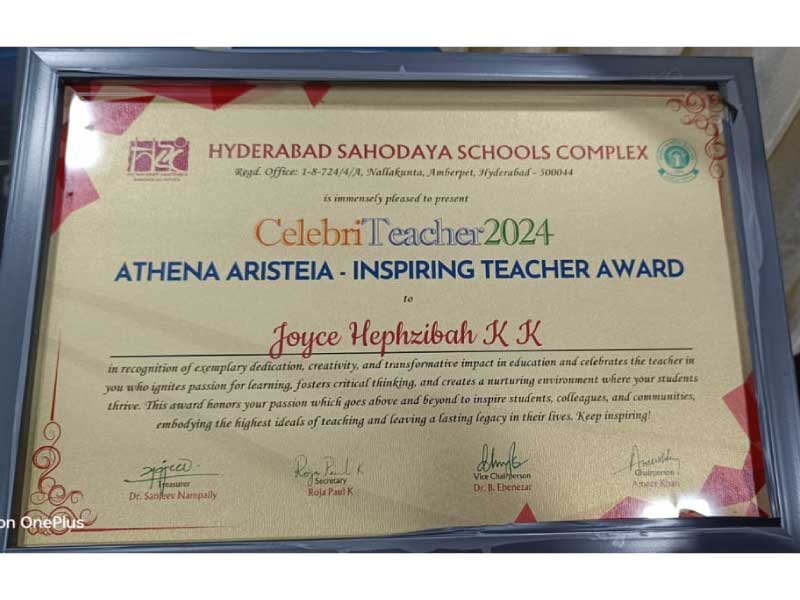 We are proud to announce the name of Joyce H, to have won the Inspiring Teacher award for the year 2024 for the Mehdipatnam CBSE cluster from Birla Open Minds International School, Bandlaguda Jagir .