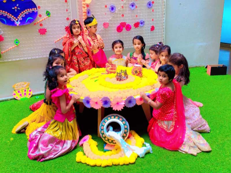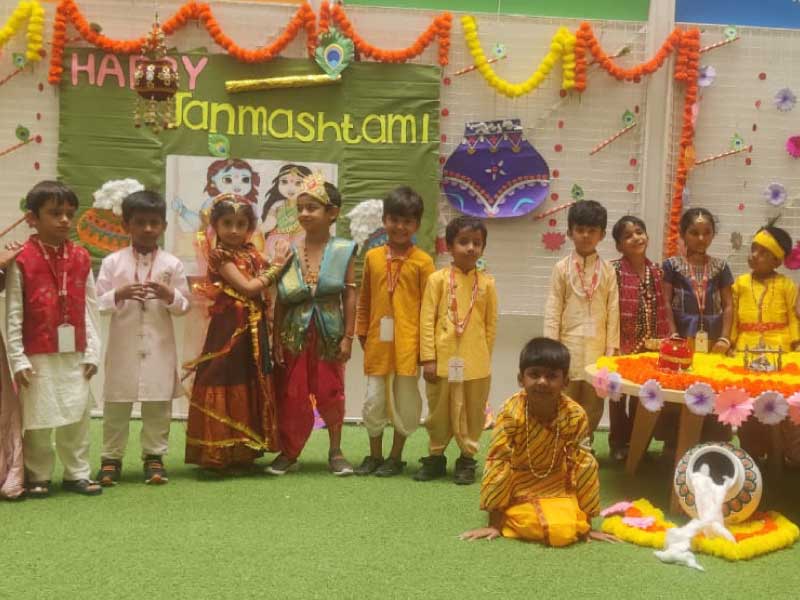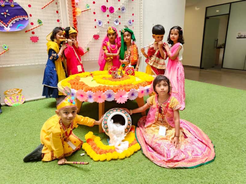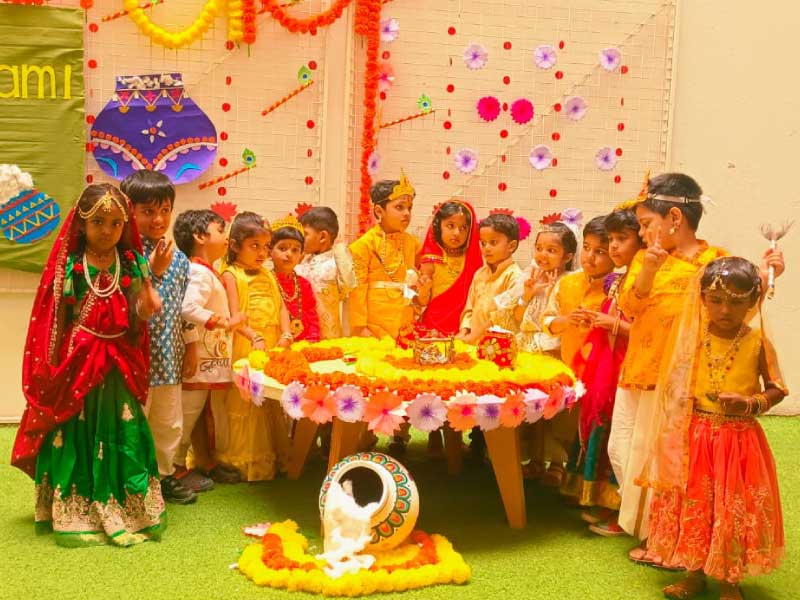 Here comes our little adorable Kanha's and Radika's! Students dressed up for the Krishna Janmashtami celebration, had a fantastic time breaking the handi, danced, and sang along to the music. They created a craft project to make peacock feathers as their day's finale. They had a terrific time discovering the significance of the day.